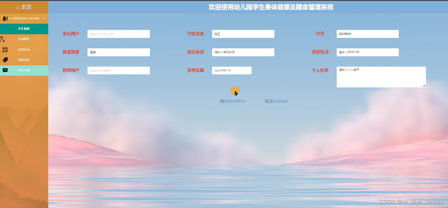 厨师用户可以实现主页、个人资料(个人信息、修改密码)、学生信息、定制餐单、食品信息、放假安排等功能模块。