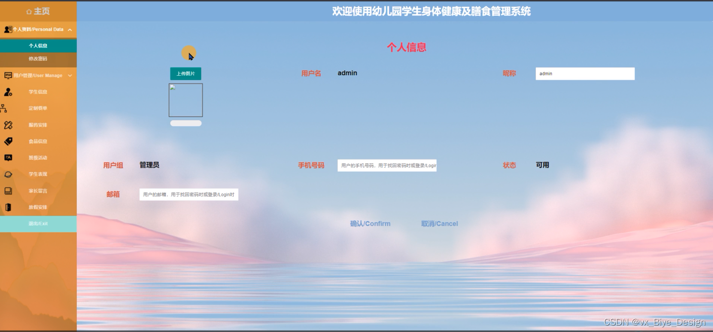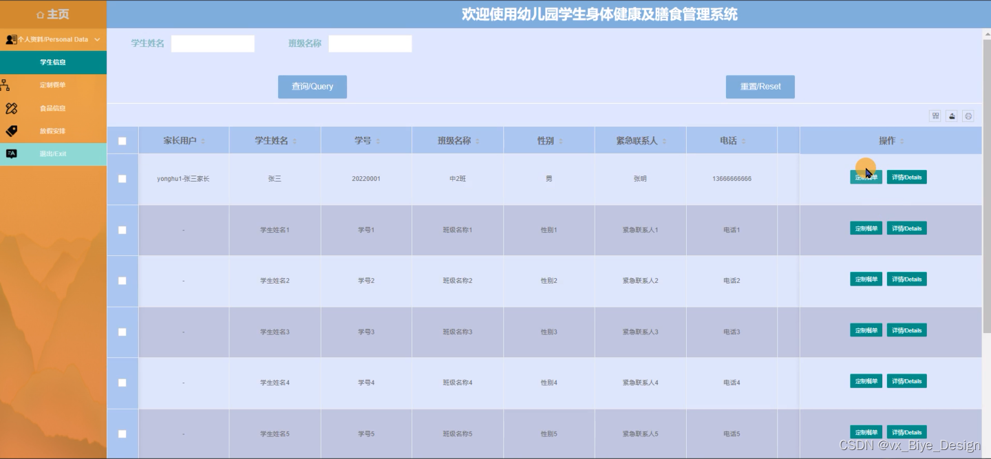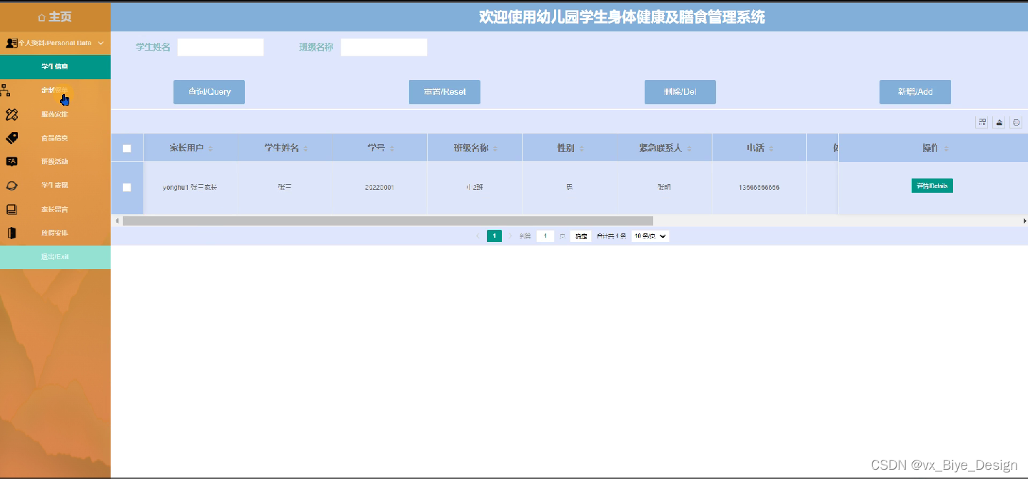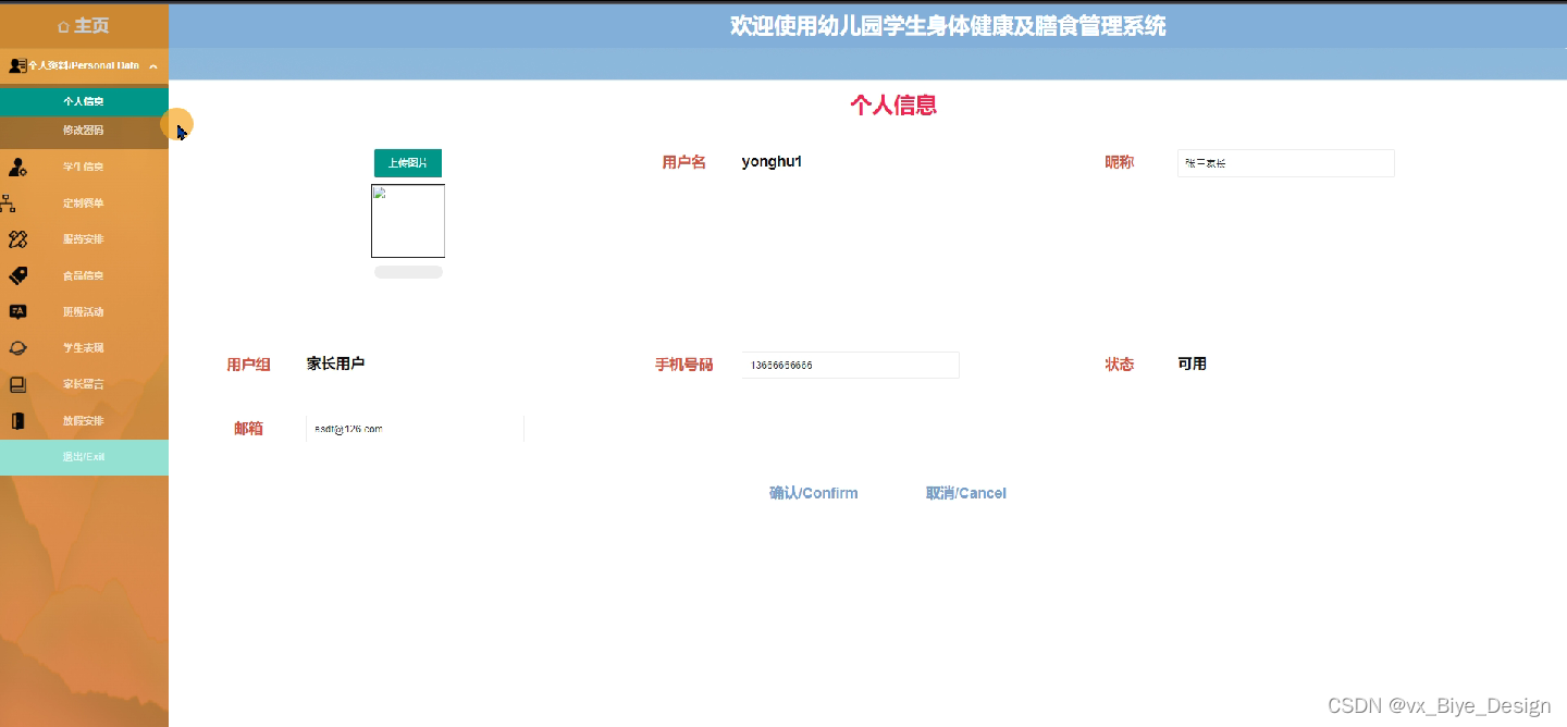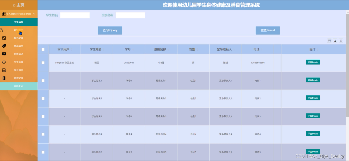 幼儿园学生身体健康及膳食管理系统的后台中,管理员对用户在前台提交申请产生的数据进行处理,以满足用户的需求。前台系统和后台系统有数据交互,整个系统各个部分相互独立又密不可分。后台的功能主要包括后台:主页、个人资料、用户管理、学生信息、定制餐单、服药安排、食品信息、班级活动、学生表现、家长留言、放假安排等功能模块。