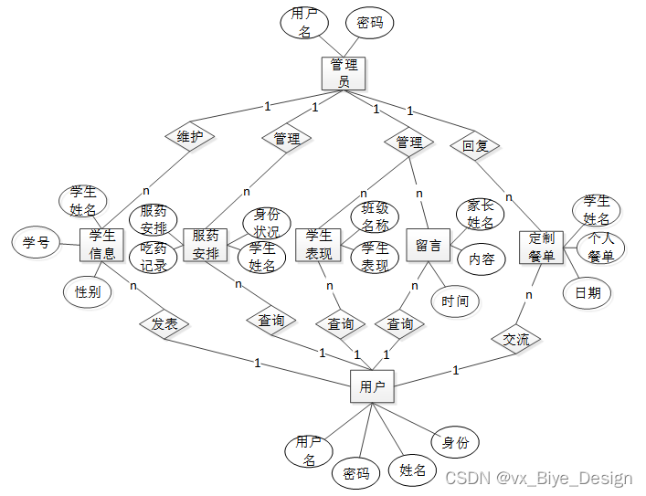 概念设计包括实体和联系两部分,如该系统中,用户是一个实体,其属性包括用户 ID 标识、用户名、密码、电话、身份等属性。联系是指实体之间有意义的关联,包括一对一、一对多、多对多三种类型。