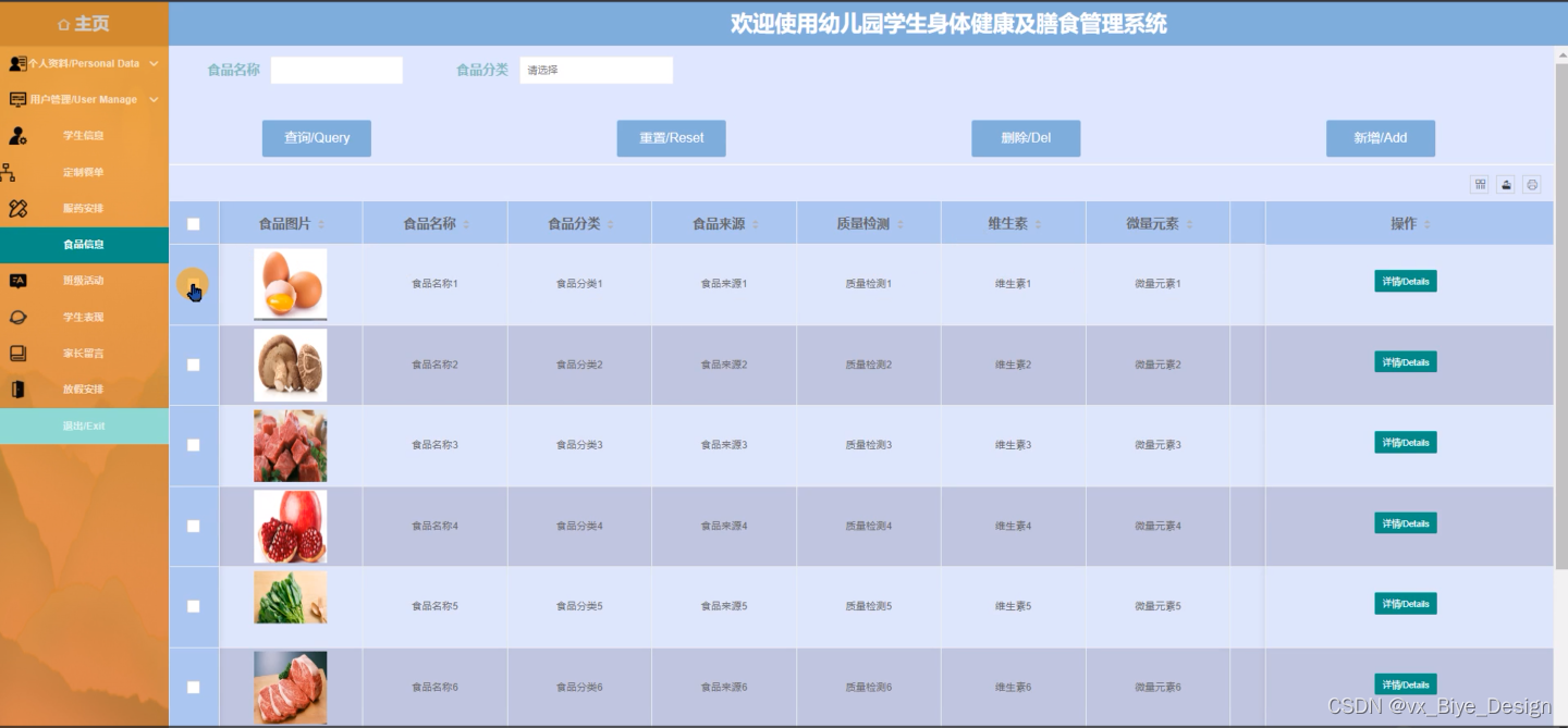 幼儿园学生身体健康及膳食管理系统中的管理人员在“食品信息”这一菜单中是可以对幼儿园学生身体健康及膳食管理系统内的食品信息进行添加、重置、查询或删除等操作,界面如下图5-14所示。