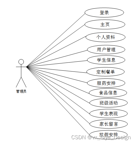 管理员所能使用的功能主要有:主页、个人资料(个人信息、修改密码)、用户管理(管理员、家长用户、教师用户、厨师用户、校医用户)、学生信息、定制餐单、服药安排、食品信息、班级活动、学生表现、家长留言、放假安排等功能模块。