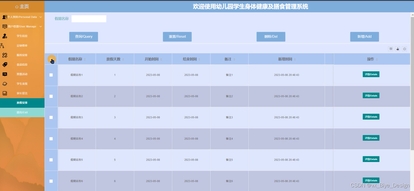 幼儿园学生身体健康及膳食管理系统中的管理人员在“放假安排”这一菜单下是可以对放假安排信息进行添加、重置、查询或删除等操作,其管理界面如下图5-15所示。