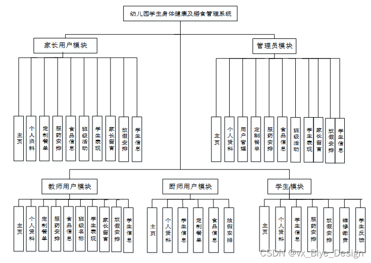 (3)确定好系统使用的技术,进行在线确认系统所划分的用户角色,并且根据用户角色划分确定所要设计的功能模块,对于幼儿园学生身体健康及膳食管理系统的设计主要划分别为管理员、家长用户、教师用户、厨师用户和校医用户角色,并所使用的功能模块也相应不同,但是系统的数据库实现的内容是交互的,用户可以随时根据自己的需求进行信息搜索,对于系统工作人员可以根据自己的分管内容进行在线信息的处理及操作,管理员获取到所有用户的详细数据信息,并根据需求进行第一时间处理解决。