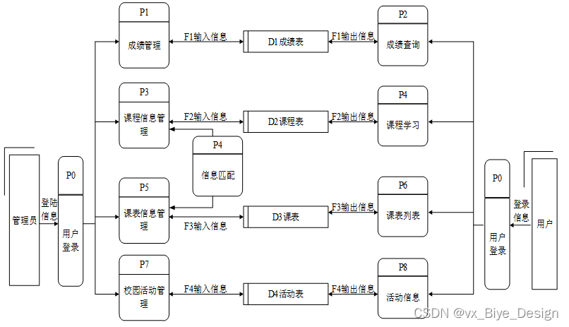 对系统的数据流进行分析,系统的使用者分为二类,一般用户(学生),管理员。系统主要对界面信息传送,登录信息的验证,注册信息的接收,用户各种操作的响应做处理。