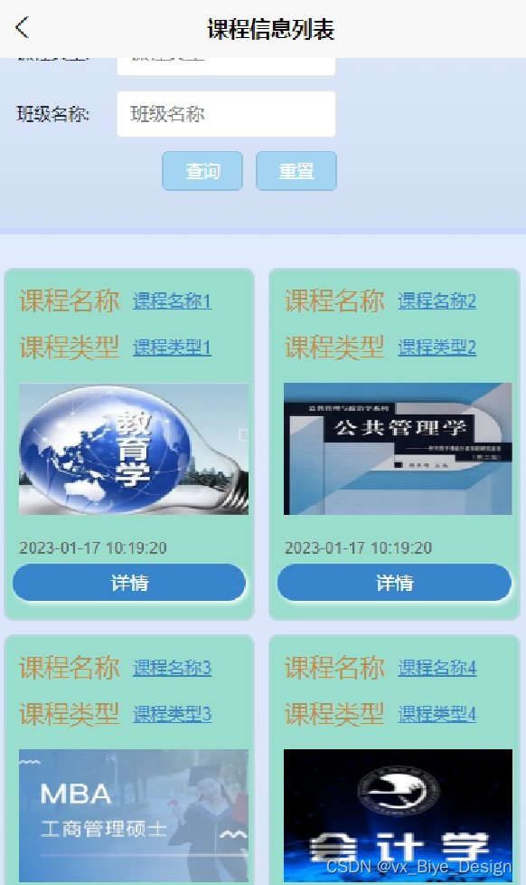 课程:存放给课程的内容,包括课程类型、课程名称、班级名称、课程学期、封面、课程内容等数据项。
