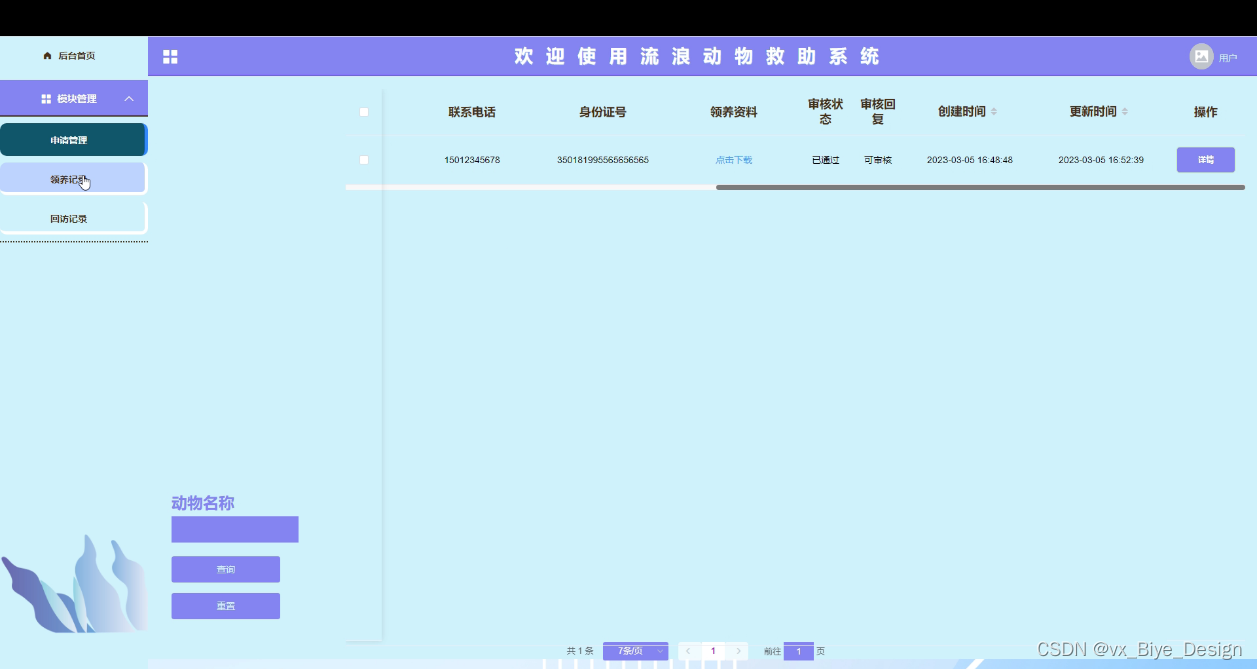 申请管理,用户在此页面可以查询领养申请的审核情况,如图5-7所示。