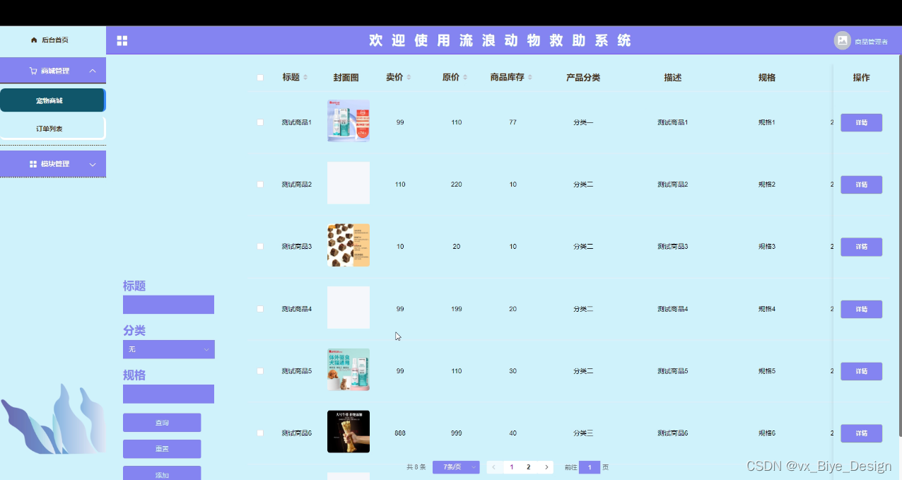 宠物商城,在此页面商品管理员可以管理商品信息,还进行查询,重置,删除,添加等操作,如图5-16,17所示。