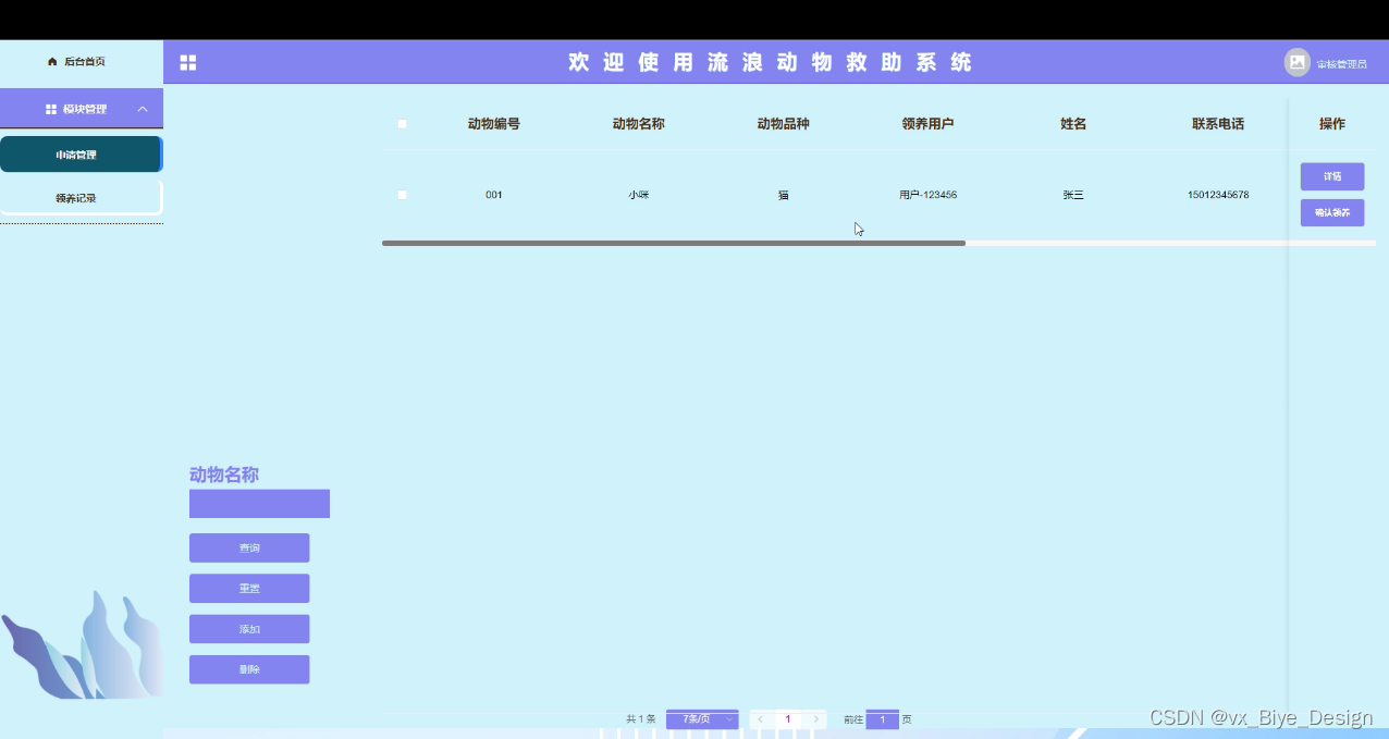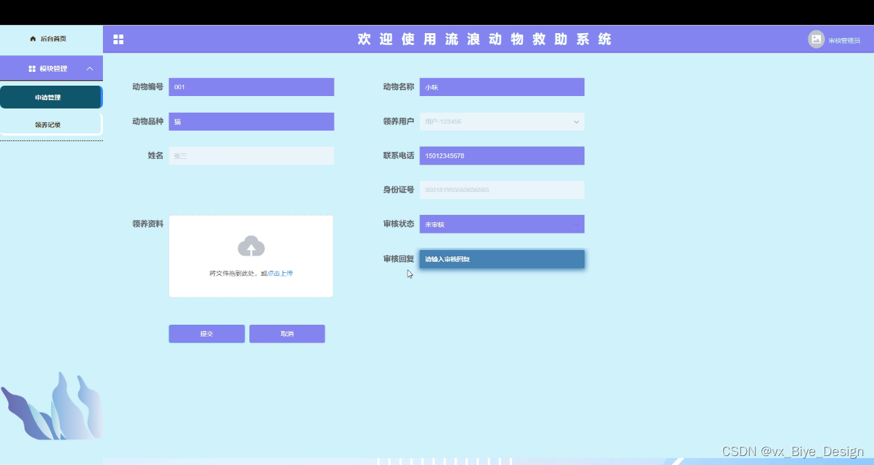 申请管理,在此页面审核管理员可以对用户提交的领养申请继进行审核,还可以进行查询,重置,删除,添加等操作,如图5-12,13所示。
