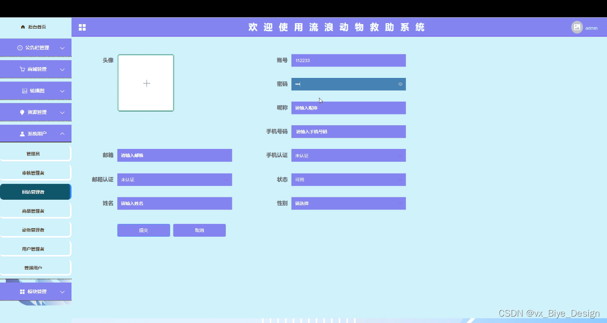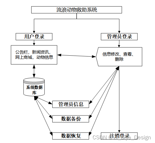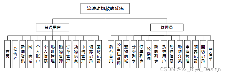 使用流浪动物救助系统系统的用户分管理员、普通用户两中角色的权限子模块。