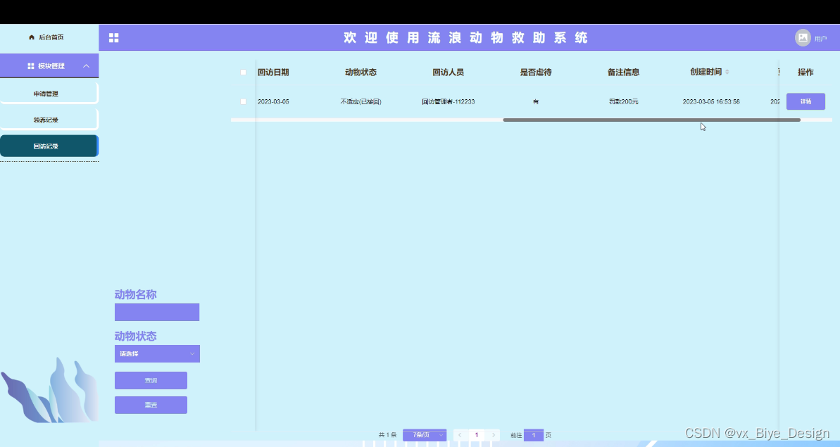 流浪动物救助系统主要是为了方便爱心人士通过合法合理途径领养宠物。也是为了更好的让管理员进行更好存储所有数据信息及快速方便的检索功能,对系统的各个模块是通过许多今天的发达系统做出合理的分析来确定考虑用户的可操作性,遵循开发的系统优化的原则,经过全面的调查和研究。