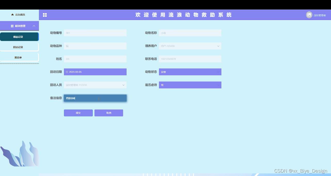 流浪动物救助系统的整体功能模块的实现,主要是对自己在大学这几年时间所学内容的一个测试,对于系统,主要是通过现在智能化的流浪动物救助系统进行校园论坛,校园新闻的发布,查阅和管理。管理员根据问题信息进行科研成果信息及留言信息管理等操作,并且可以根据需求进行数据信息的增加修改删除等操作。