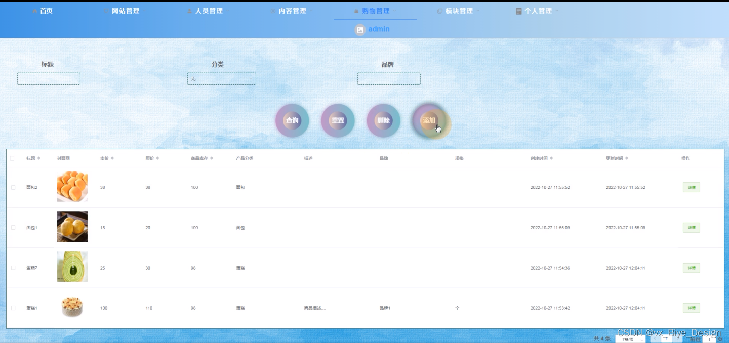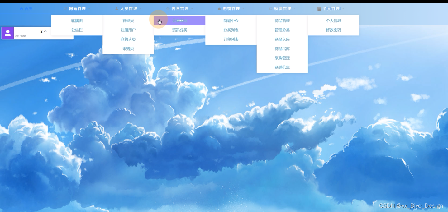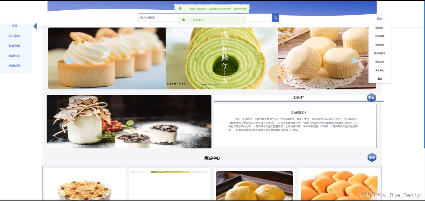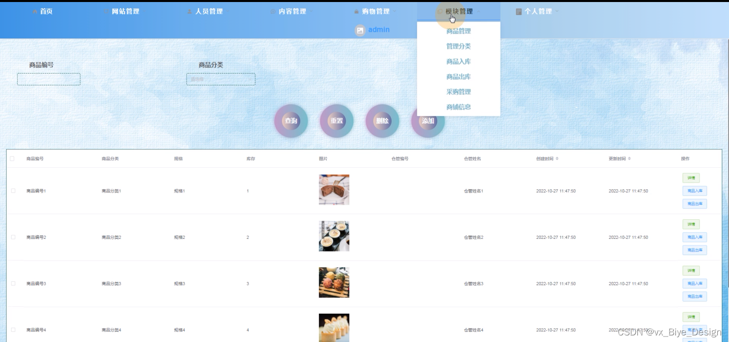 模块包括管理员:后台首页,网站管理(轮播图管理、公告栏),人员管理(管理员,注册用户、仓管人员、采购员),内容管理(美食资讯、资讯分类),购物管理(商城中心、分类列表、订单列表),模块管理(商品管理、管理分类、商品入库、商品出库、采购管理、商铺信息)、个人管理等进行相应的操作。