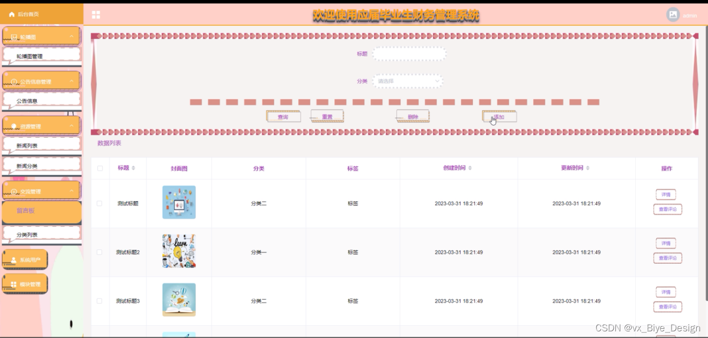 内容管理-资讯分类,在此页面管理员可以对美食资讯进行分类,查询,重置,删除,添加等操作,如图5-12所示。