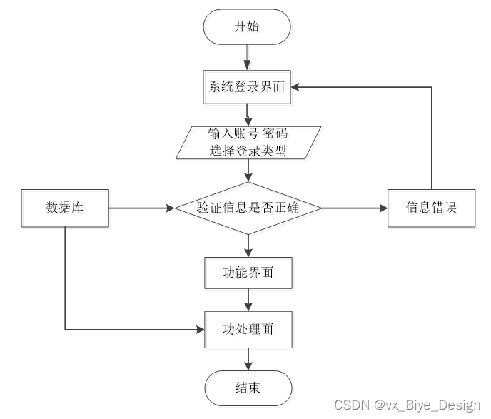用户想进入系统,首先进入系统登录界面,通过正确的用户名、密码等信息,系统会检查登录信息,信息正确,然后输入相应的功能界面,提示信息错误,登录失败。系统操作流程如图3-4所示。