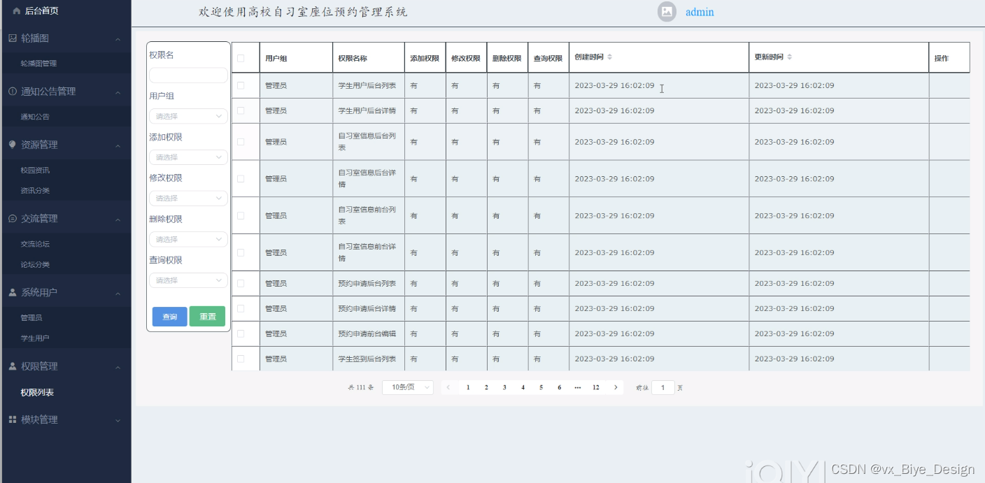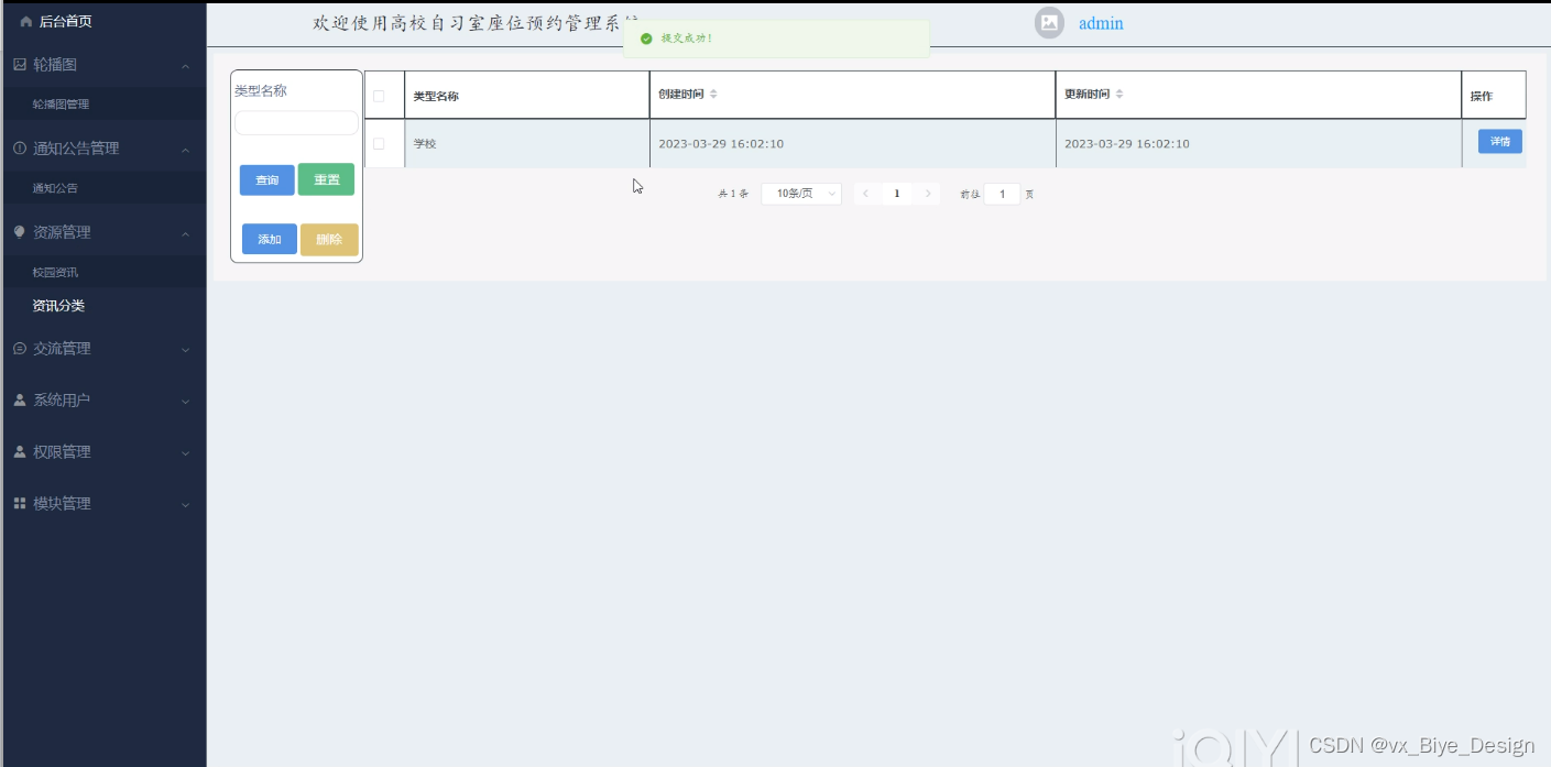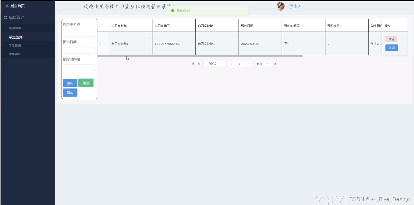 高校自习室座位预约管理系统的开发利用现有的成熟技术参考,以源代码为模板,分析功能调整与高校自习室座位预约管理系统的实际需求相结合,讨论了基于高校自习室座位预约管理系统的使用。