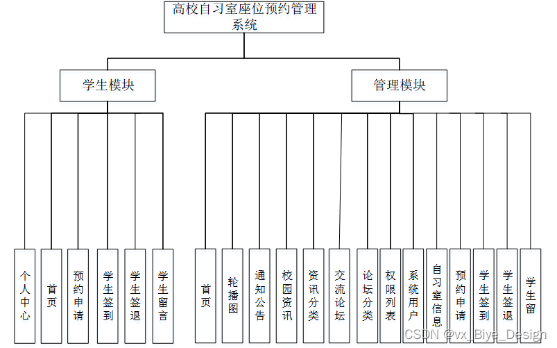 这些功能可以充分满足高校自习室座位预约管理系统的需求。此系统功能较为全面如下图系统功能结构如图4-5所示。