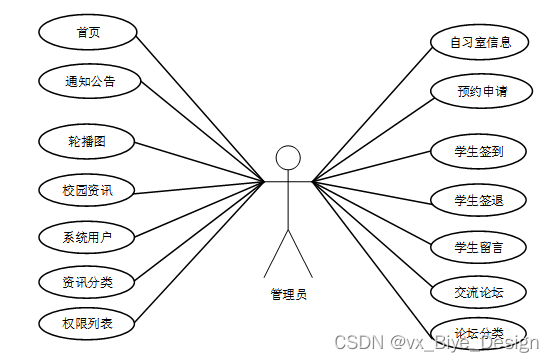 基于自习室座位预约管理系统的设计基于现有的手机,可以实现管理员:后台首页、轮播图(轮播图管理)、通知公告管理(通知公告)、资源管理(校园资讯、资讯分类)、交流管理(交流论坛、论坛分类)、系统用户(管理员、学生用户)、权限列表(权限列表)、模块管理(自习室信息、预约申请、学生签到、学生签退、学生留言)等详细的了解及统计分析。根据系统功能需求建立的模块关系图如下图:
