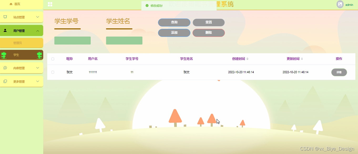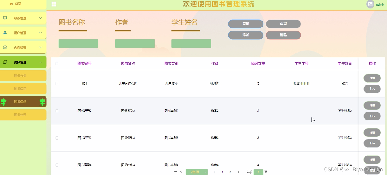 管理员模块:首页、站点管理(轮播图、公告栏)、用户管理(管理员、学生)、内容管理(图书资讯、资讯分类)、更多管理(图书信息、图书借阅、图书归还)。