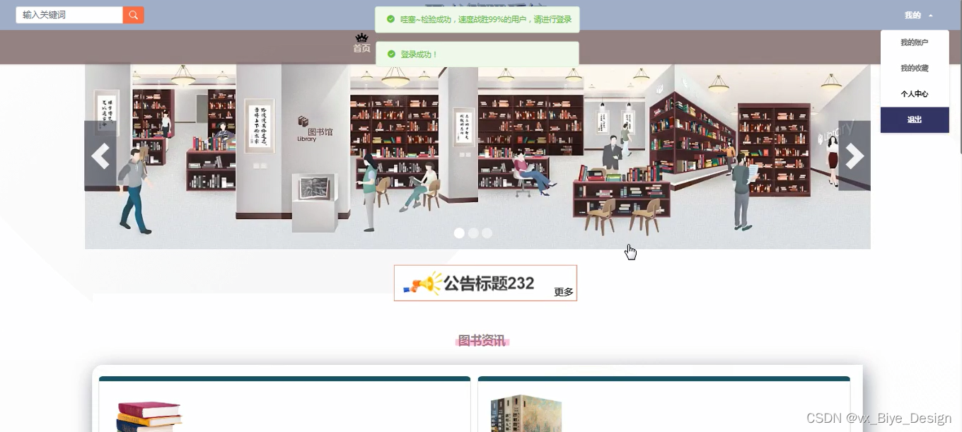 用户模块:首页、公告消息、图书资讯、图书信息(借阅、点赞、收藏)、我的(我的账户、我的收藏、个人中心、退出)。