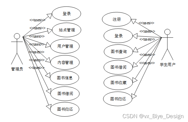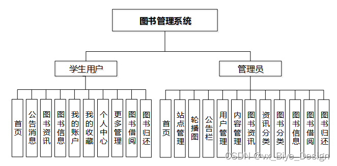 根据用户对系统的需求,要求系统简单操作,能够准确,完整的对信息进行管理。图书管理系统在对需求做解析后,整个系统主要分为两个部分:管理员和学生用户,每个模块下的分支功能不一样。对功能做出如下说明: