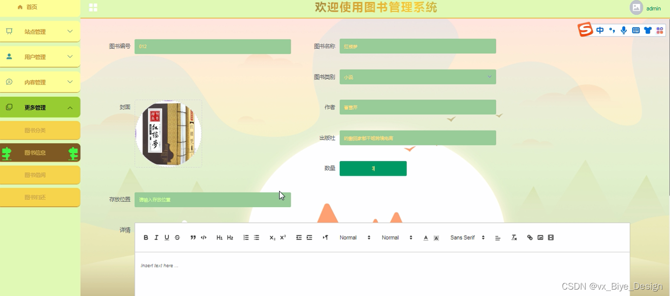 The technologies involved in the front-end interface of this system mainly include JSP, HTML, JQUERY, etc. Through these technologies, the aesthetic and dynamic effects of the front-end page can be achieved to make it conform to the aesthetic standards of the masses. The technologies used in the background mainly include Java programming language, MD5 encryption technology, MySQL database, JSP and AJAX asynchronous interaction. According to the AJAX asynchronous mode, the library management system solves the problems of manpower The waste of material resources and time and the limitation of communication depth make the communication process faster, more accurate and more convenient, and complete the basic functions of the book management system: book information, information classification, book information, book borrowing, and book return.