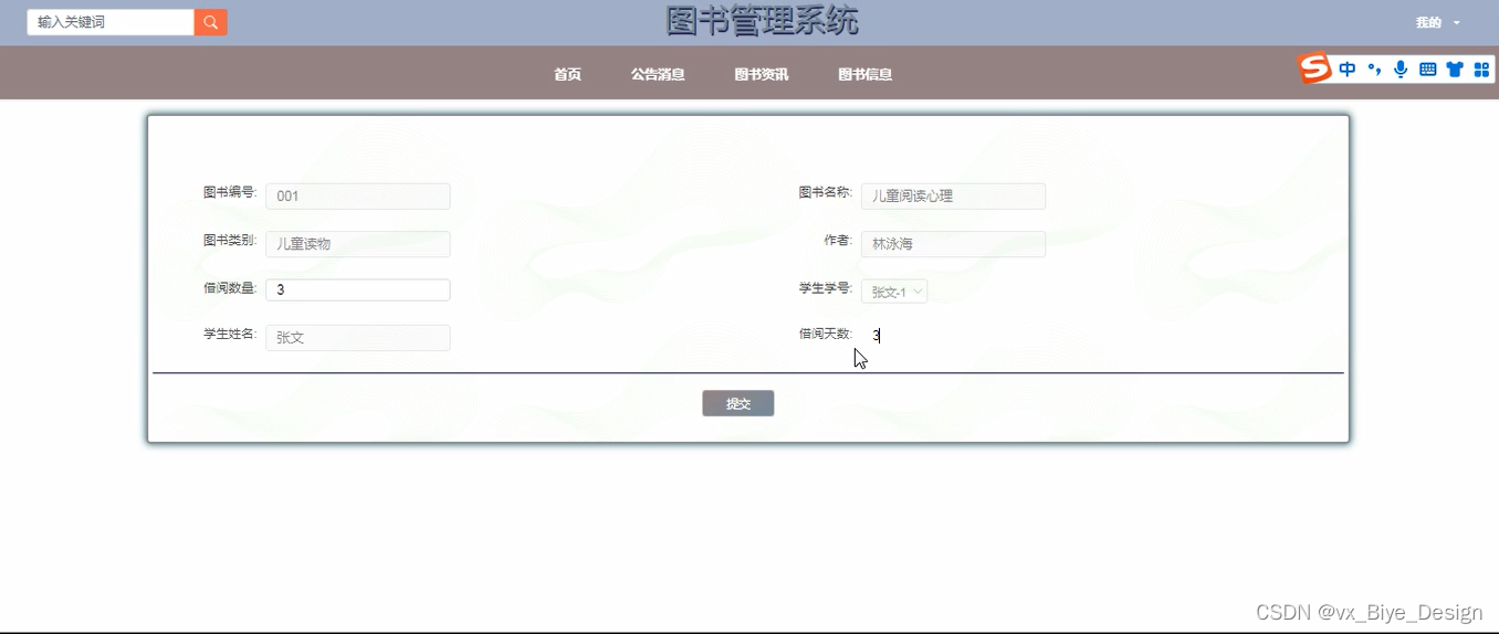 | 事件流 | (1)在图书页点击要借阅的图书 (2)填写图书借阅数据 |