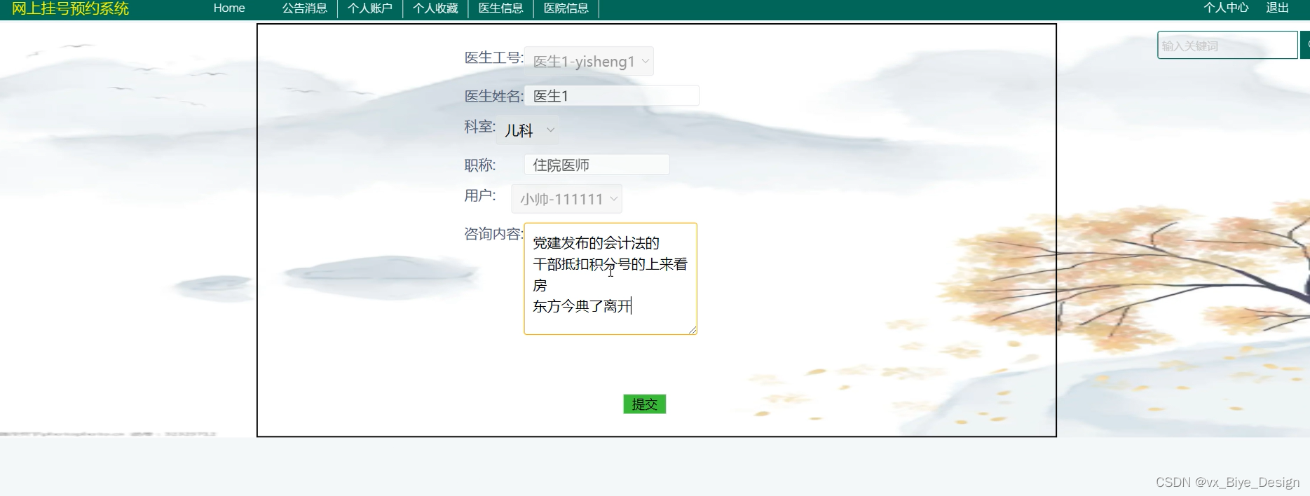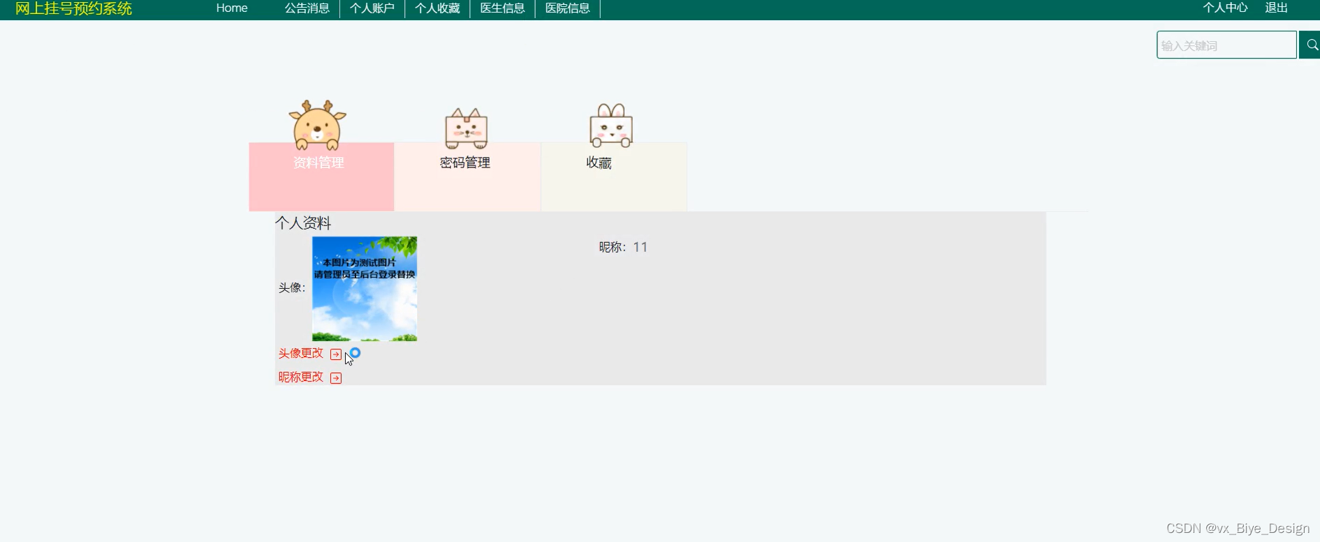 登录后进入收首页,可以查看到Home、公告消息、个人账户、个人收藏、医生信息、医院信息、个人中心等功能。首页界面如下图所示。