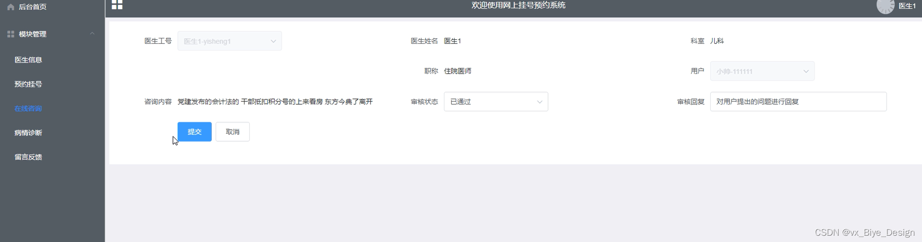 在线咨询,用户可以在线填写咨询内容等信息,进行提交等操作。医生在后台对在线咨询进行回复等操作。