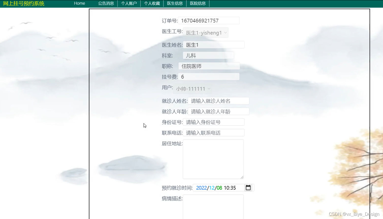 预约挂号可以填写就诊人姓名、就诊人年龄、身份证号、联系电话、预约就诊时间等信息,进行预约挂号等操作。