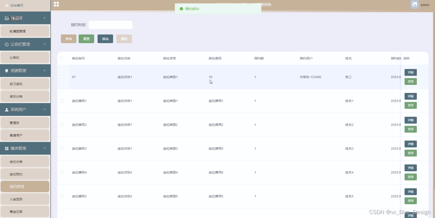 | 预期结果 | 提交以后,页面首页会显示新的座位预约 |