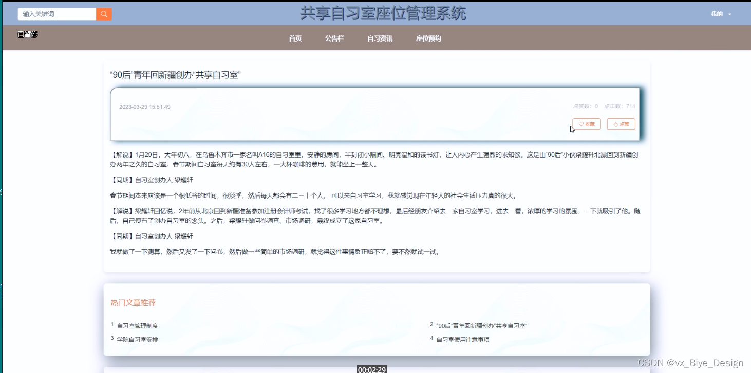 (3)自习资讯:用户可以查看自习资讯信息,在查询到自己想要了解的自习资讯的时候,可以进入查看详细的介绍进行评论、点赞、收藏操作。