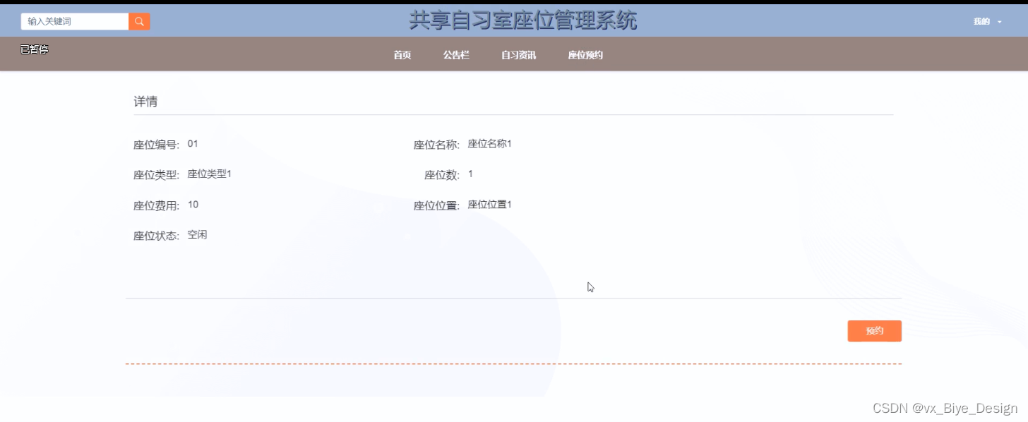 (6)座位预约:用户可以查看座位预约信息支持通过搜索关键词的方式对座位预约进行查询,在查询到自己想要了解的座位预约的时候,可以进入查看详细的介绍。
