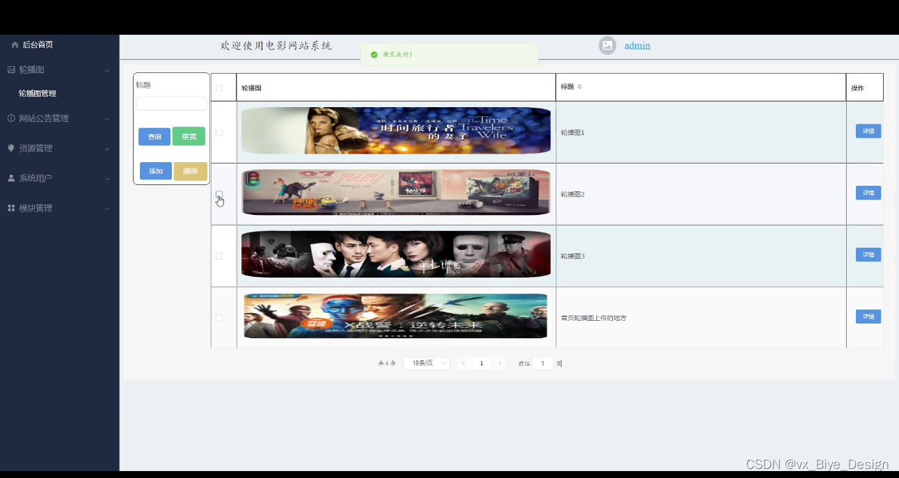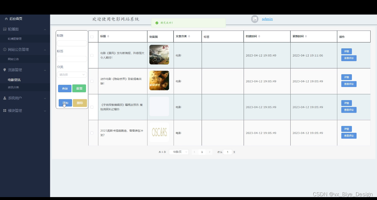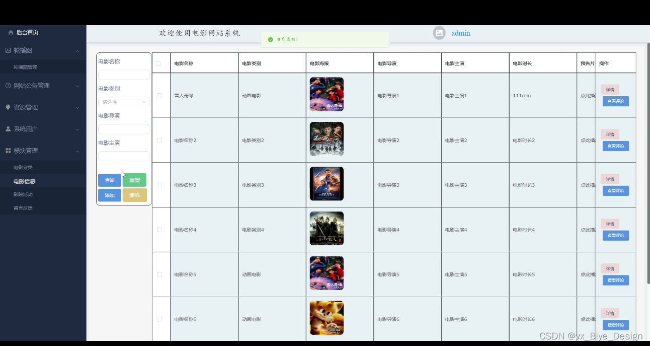 管理员登录电影网站系统,管理员后台功能为:后台首页,轮播图管理,网站公告管理,资源管理(电影资讯,资讯分类),系统用户(管理员,注册用户),模块管理(电影分类,电影信息,影院活动,留言反馈)等功能,如下图所示: