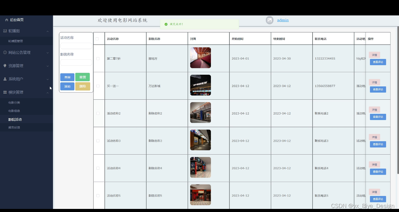影院活动,管理员在此界面可维护管理影院活动,还可在此页面对进行重置,删除,添加等操作,如下图所示: