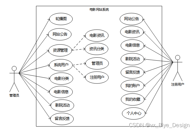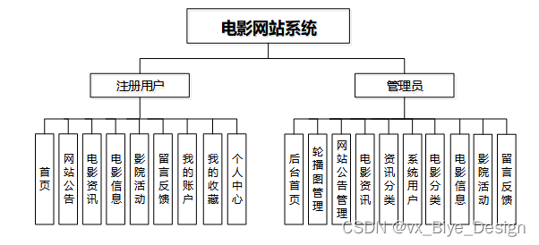 (1)功能要求:首页,轮播图管理,网站公告管理,资源管理(电影资讯,资讯分类),系统用户(管理员,注册用户),模块管理(电影分类,电影信息,影院活动,留言反馈)等功能模块。