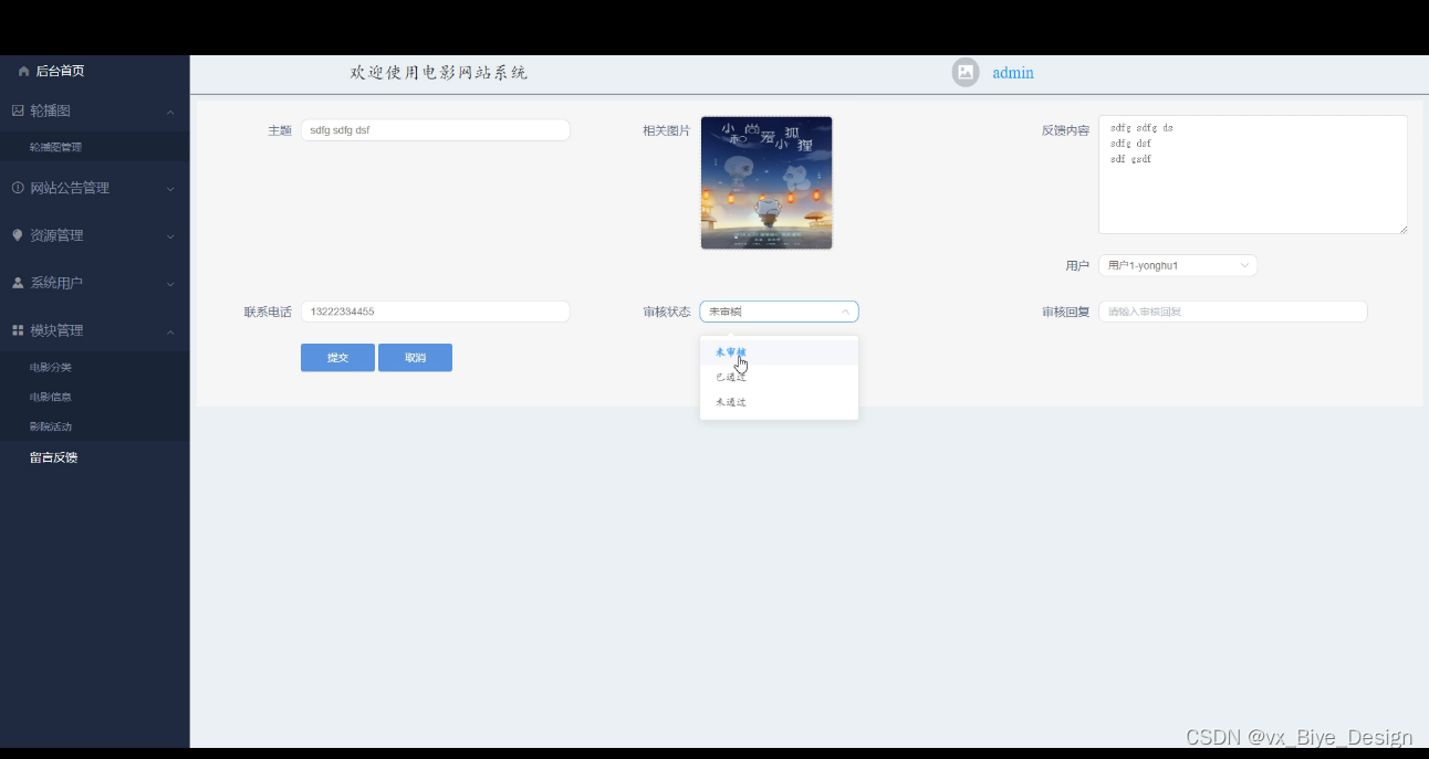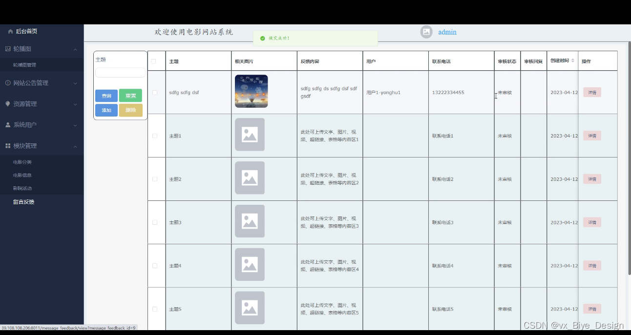 留言反馈,管理员在此界面可维护管理用户提交的留言反馈,还可在此页面对进行重置,删除,添加,审核等操作,如下图所示: