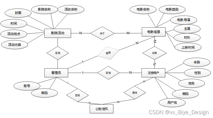 通过电影网站系统的功能进行规划分成几个实体信息,实体信息将通过ER图进行说明,本系统的主要实体图如下: