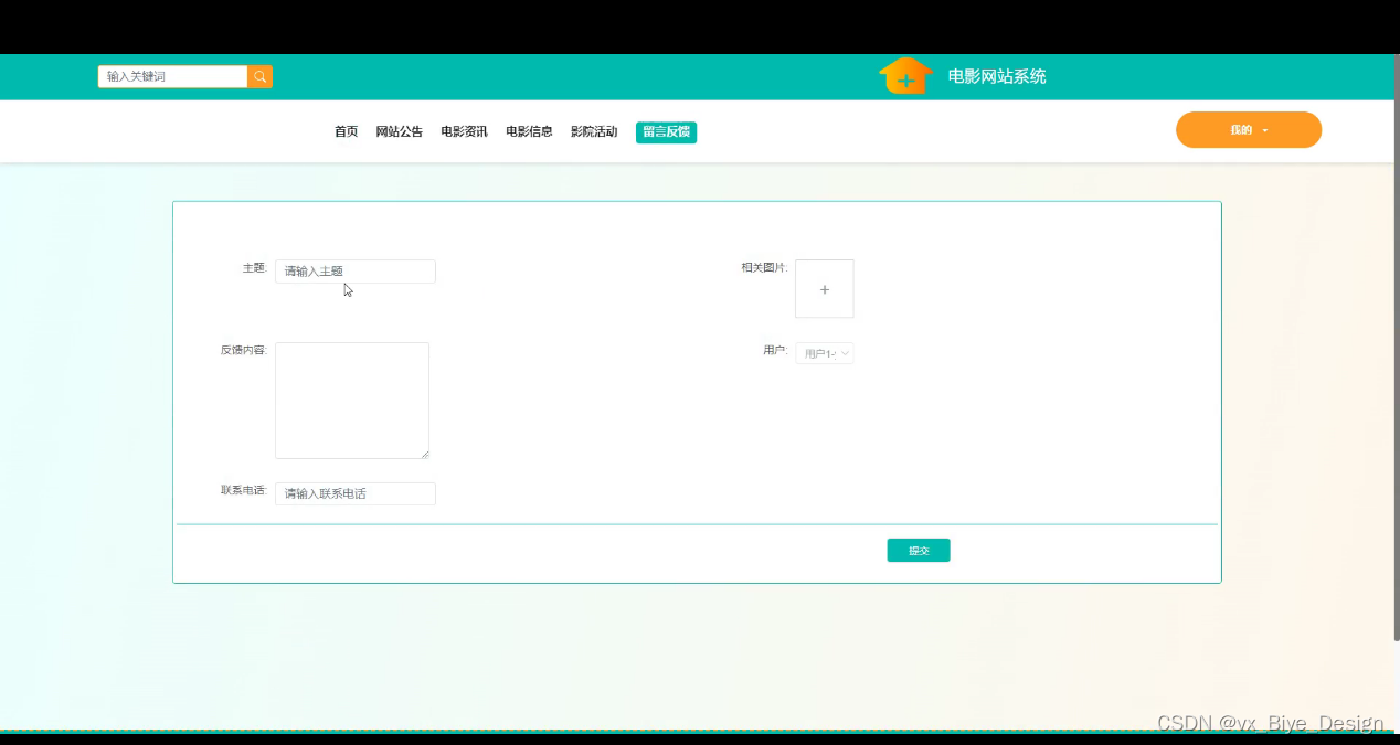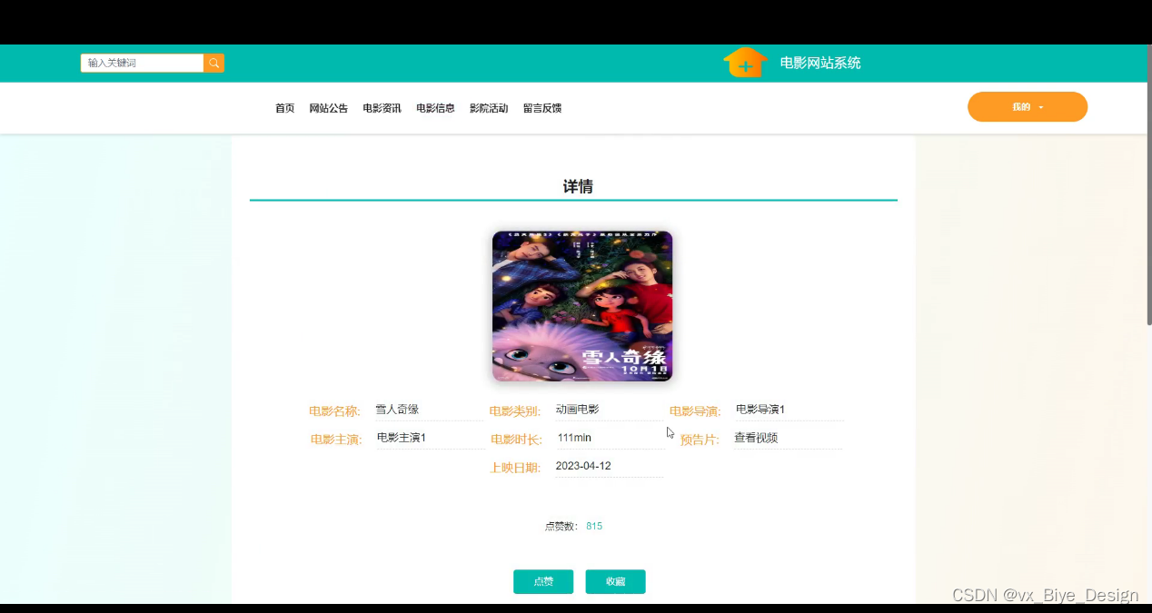 注册用户登录电影网站系统,功能有首页,网站公告,电影资讯,电影信息,影院活动,留言反馈,我的(我的账户,我的收藏,个人中心)等,如下图所示: