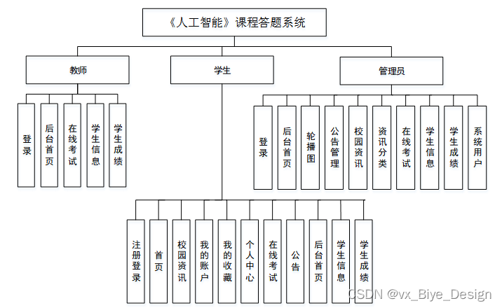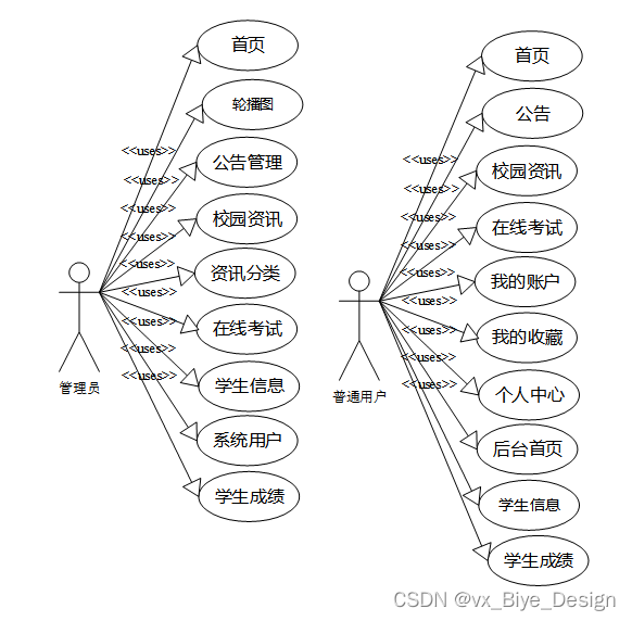 (1)功能要求:首页,轮播图,公告管理,资源管理(校园资讯、资讯分类、在线考试),系统用户(管理员,学生,教师),模块管理(学生信息、学生成绩)等功能模块。