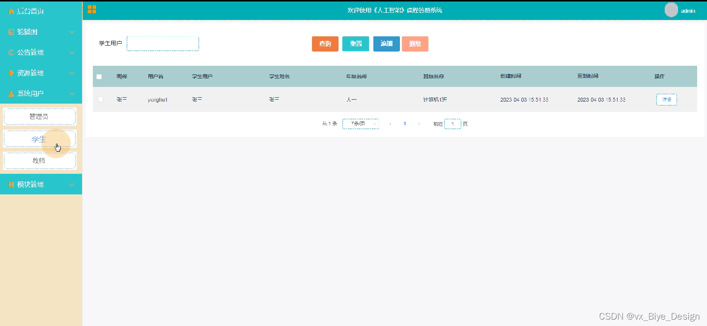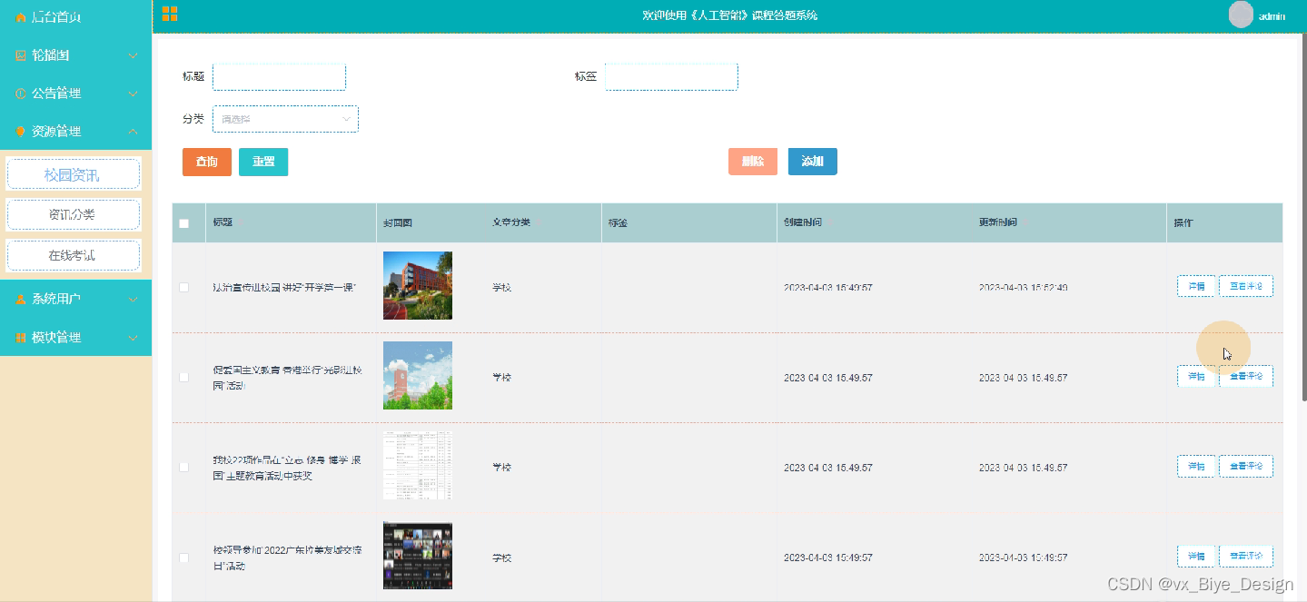 管理员登录《人工智能》课程答题系统,管理员后台功能为:后台首页:轮播图,公告管理,资源管理(校园资讯、资讯分类、在线考试),系统用户(管理员,学生,教师),模块管理(学生信息、学生成绩)等功能,如下图所示: