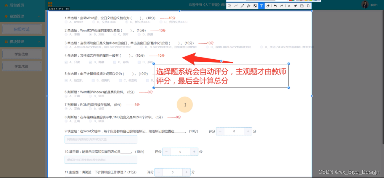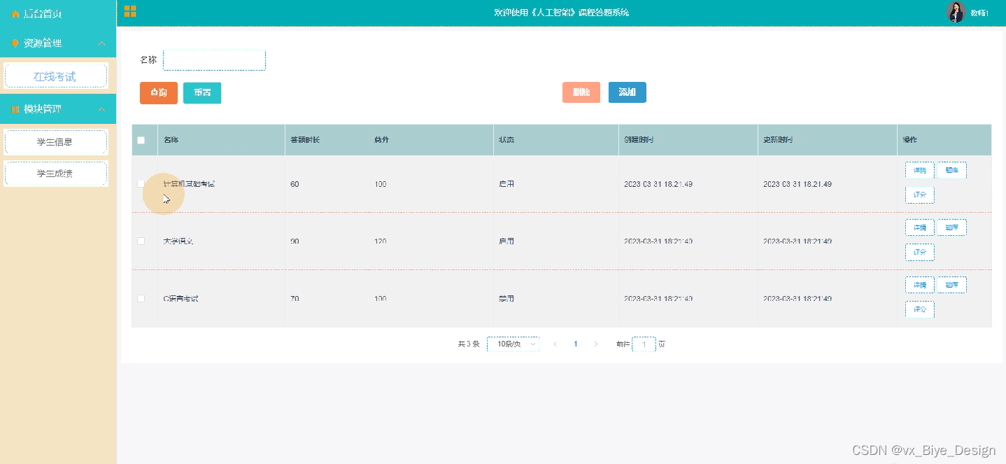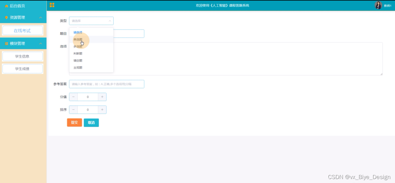教师用户登录《人工智能》课程答题系统,功能为:后台首页,资源管理(在线考试)模块管理(学生信息、学生成绩)等功能,如下图所示: