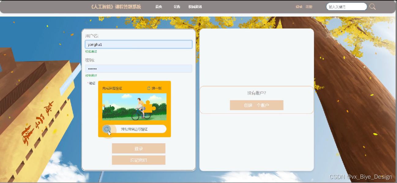 学生用户登录《人工智能》课程答题系统,功能为:首页,公告,校园资讯,在线考试,我的(我的账户,我的收藏,个人中心),后台首页,模块管理(学生信息、学生成绩)等功能,如下图所示: