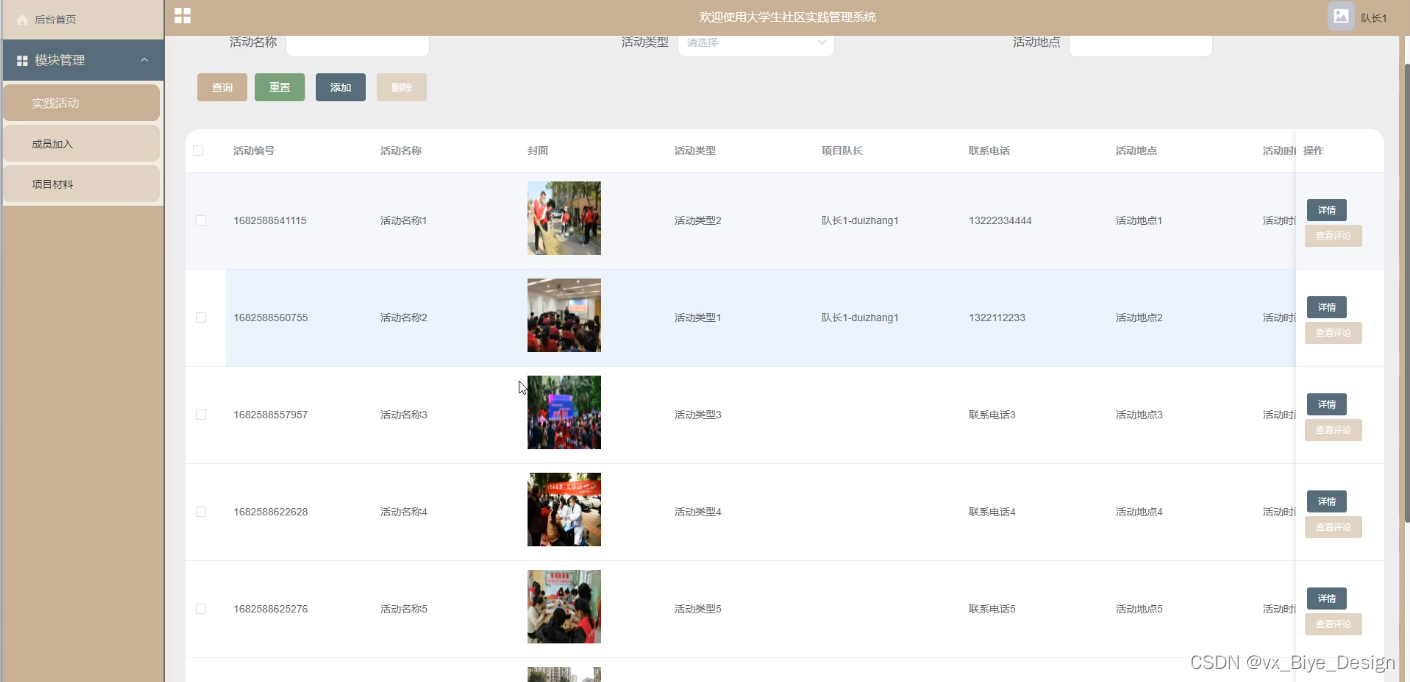 实践活动管理,在实践活动管理页面中可以对索引、活动编号、活动名称、封面、活动类型、项目队长、联系电话、活动地点、活动时间等信息进行详情查看评论、添加、或删除等操作,如图5-16所示。