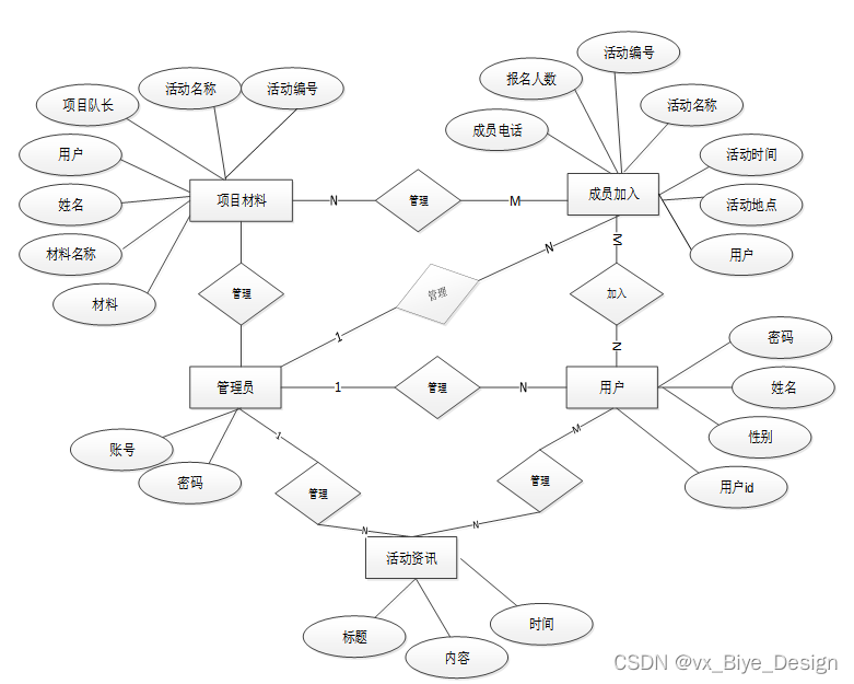 通过大学生社区实践管理系统的功能进行规划分成几个实体信息,实体信息将通过ER图进行说明,本系统的主要E-R图如下:
