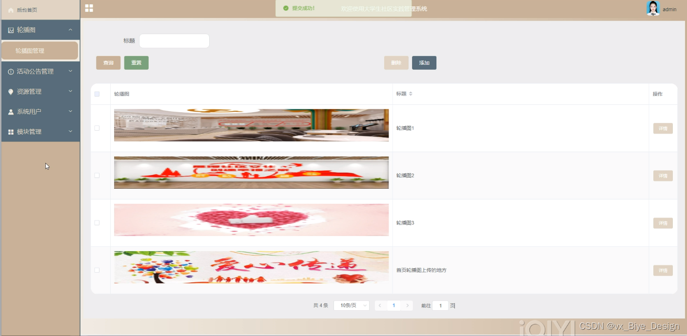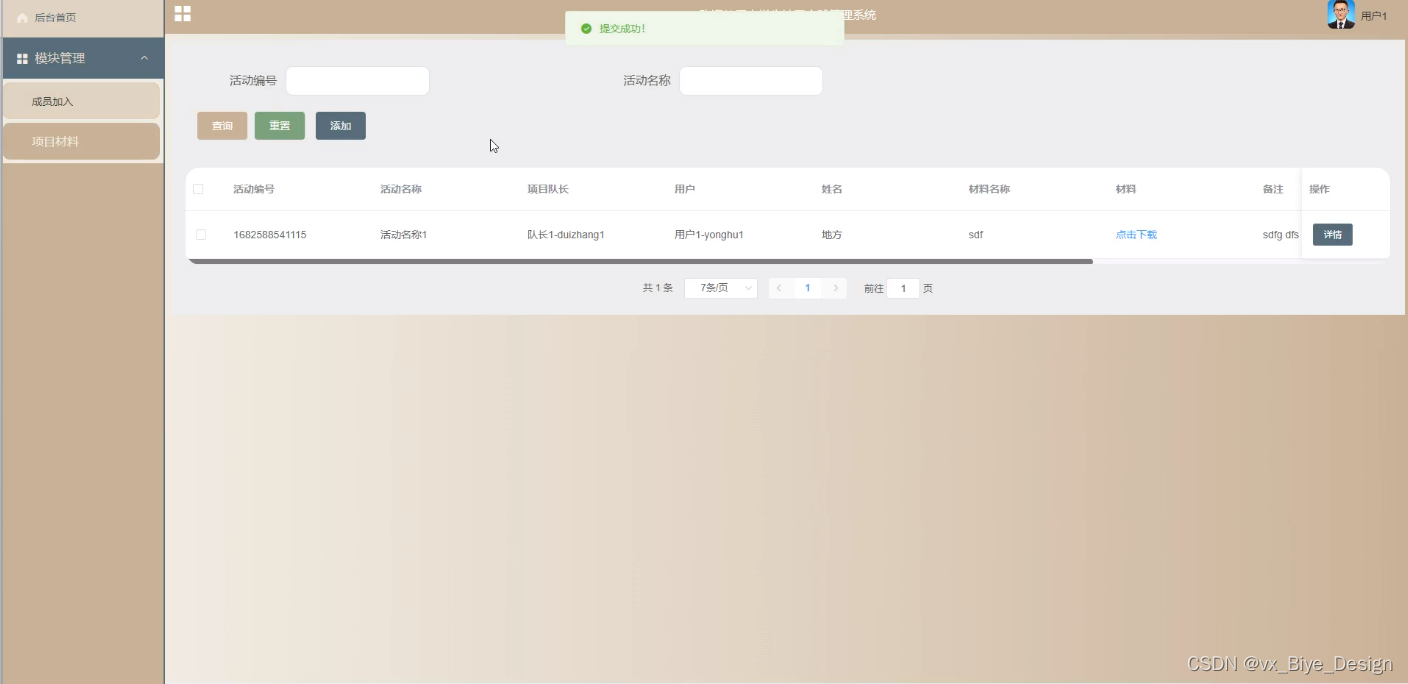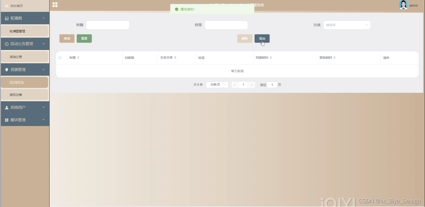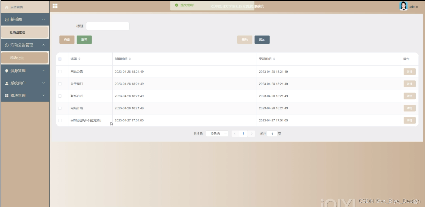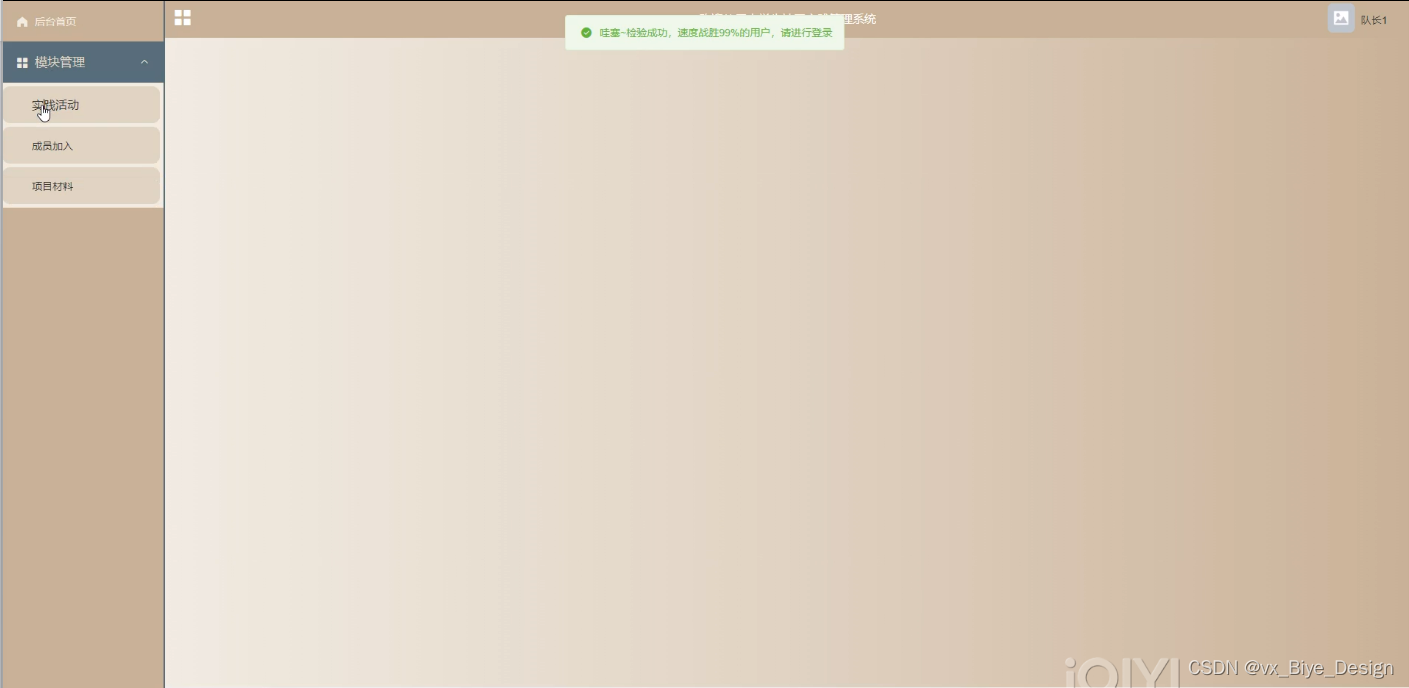 (1)功能要求:可以管理后台首页、轮播图(轮播图管理)、活动公告管理(活动公告)、资源管理(活动资讯、资讯分类)、系统用户(管理员、队长用户、普通用户)、模块管理(活动分类、实践活动、成员加入、项目材料)、个人中心等功能模块。