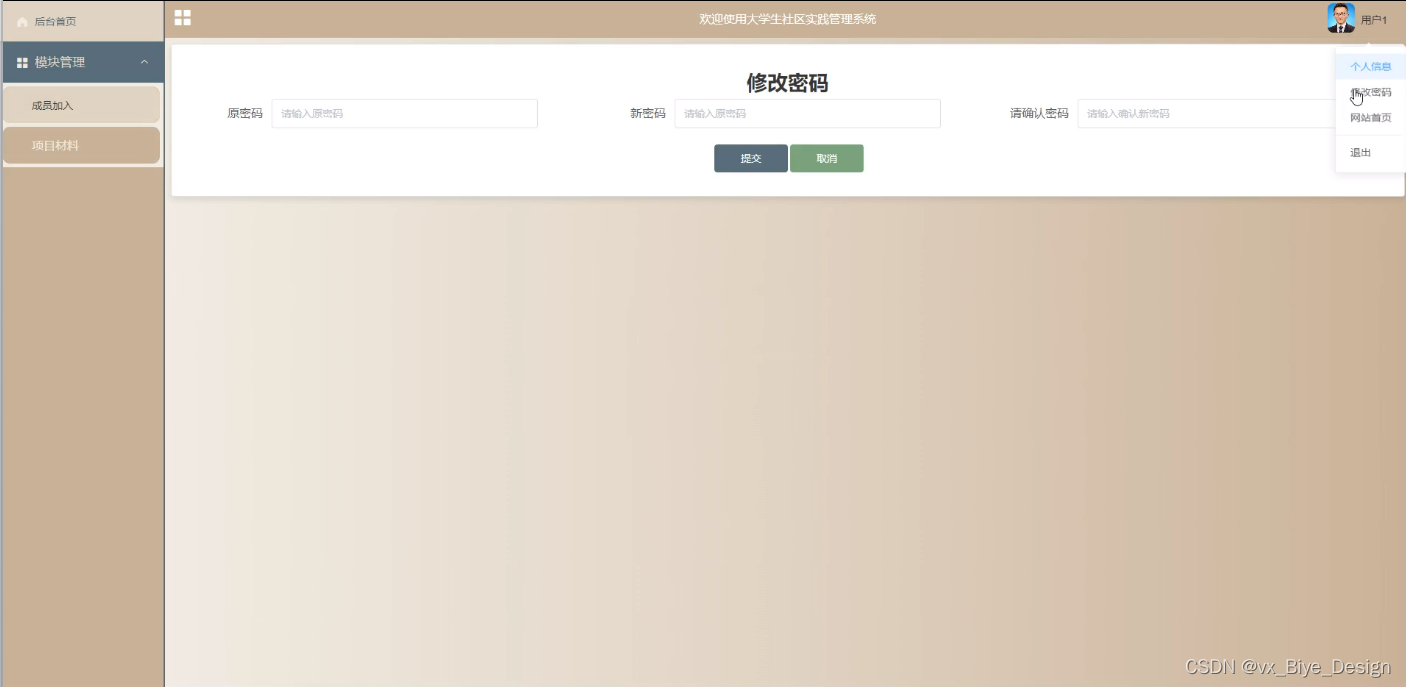 用户登录进入系统后台可以查看首页、模块管理(成员加入、项目材料)、个人中心等内容进行详细操作,如图5-11所示。
