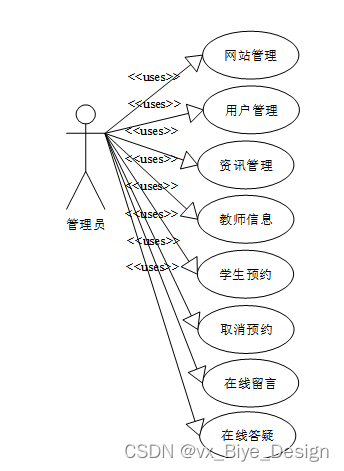 系统设计的目的是分析系统包括的所有功能结构,为开发人员设计开发和实现系统做好准备工作。经过前期的需求调查、分析和整理之后,确定的总体需求主要包括多个模块,分别是:留言管理、学生管理、教师管理、精选学生预约。系统整体角色分为三个部分,一是教师、二是学生、最后是管理员。权限分布也是很明显,学生是在除去浏览信息之外还具有查询和管理自己账户信息、学生预约、取消预约、在线答疑等权限;管理员是最高权限拥有者。