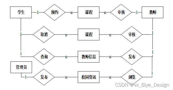 对于一个要开发的系统来说,E-R图可以让别人能更快更轻松的了解此系统的事务及它们之间的关系。根据系统分析阶段所得出的结论确定了在师生互伴答疑预约系统中存在着多个实体分别是用学生、管理员、课程、问题、教师。
