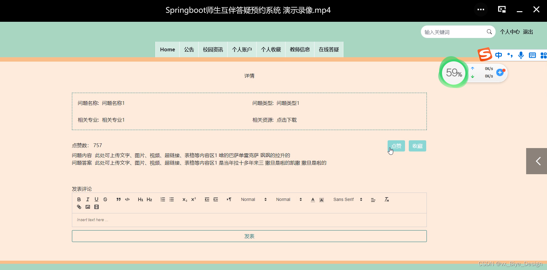 在本系统中,学生可以根据自己的时间安排自己的提问计划,不受时间地点限制,且可以向已在网站注册的任何导师提问,课程预约。对老师也一样,不一定要安排某个时间某间教室进行答疑,当老师回答了问题后,学生登录系统进行查看。实现传统教育无法做到的"个性化教育"。通过在线答疑系统一方面学生的问题得到解决,提高了学习效率,另一方面,有利于加深师生感情。本毕业设计目的是设计实现一个多学科、通用、模块化的网上学习平台,以便提高学生学习兴趣,有利于当今高校教学模式和教学方法的改革。采用非面对面教学方式的在线答疑系统,学生提交作业、提问、答疑等可以不受时间和地点的限制,体现了网上教学的开放性、交互性和自主性等特点。因此,开发一个基于springboot的师生互伴答疑预约系统是很有必要的,具有其特有的技术意义和管理意义。