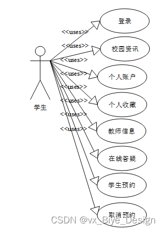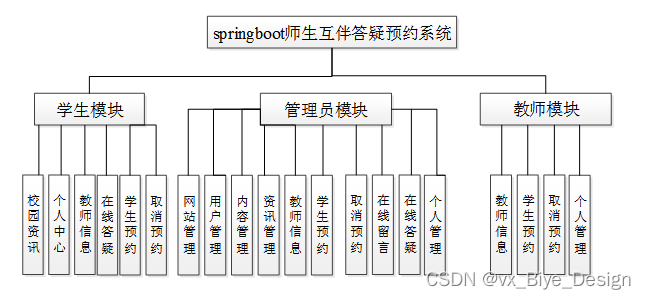 师生互伴答疑预约系统在对需求做解析后,整个系统主要分为两个部分:管理员和学生,每个模块下的分支功能不一样。对功能做出如下说明: